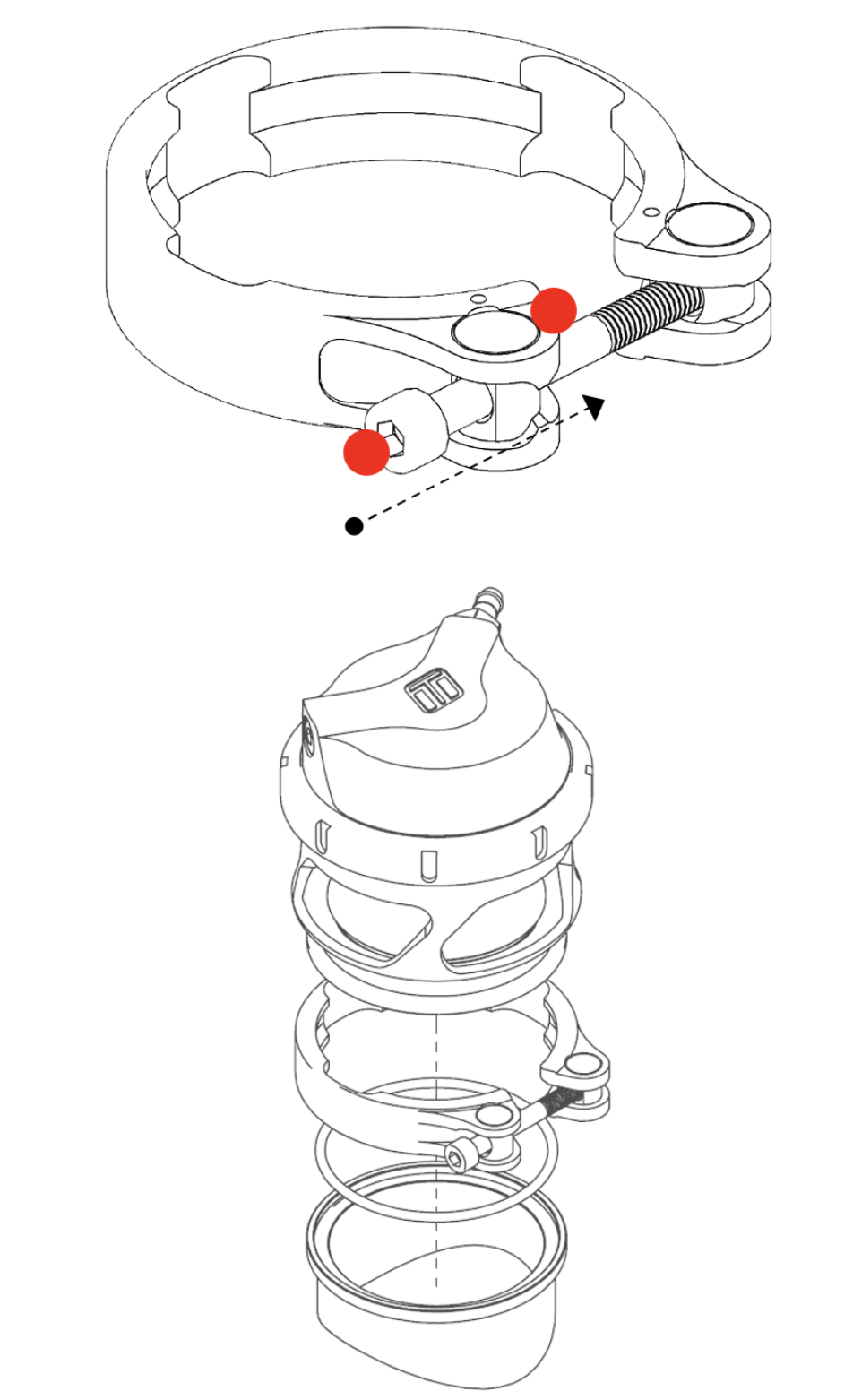 Prior to mounting the GenV ProPort, place v-band over weld on flange by unscrewing the bolt on the v-band as far out as possible and then squeezing the bolt in a syringe motion to expand the v-band (squeeze the dots together below). Once the v-band is in its fully expanded position, slide the v-band over the flange to allow for the ProPort to be installed.