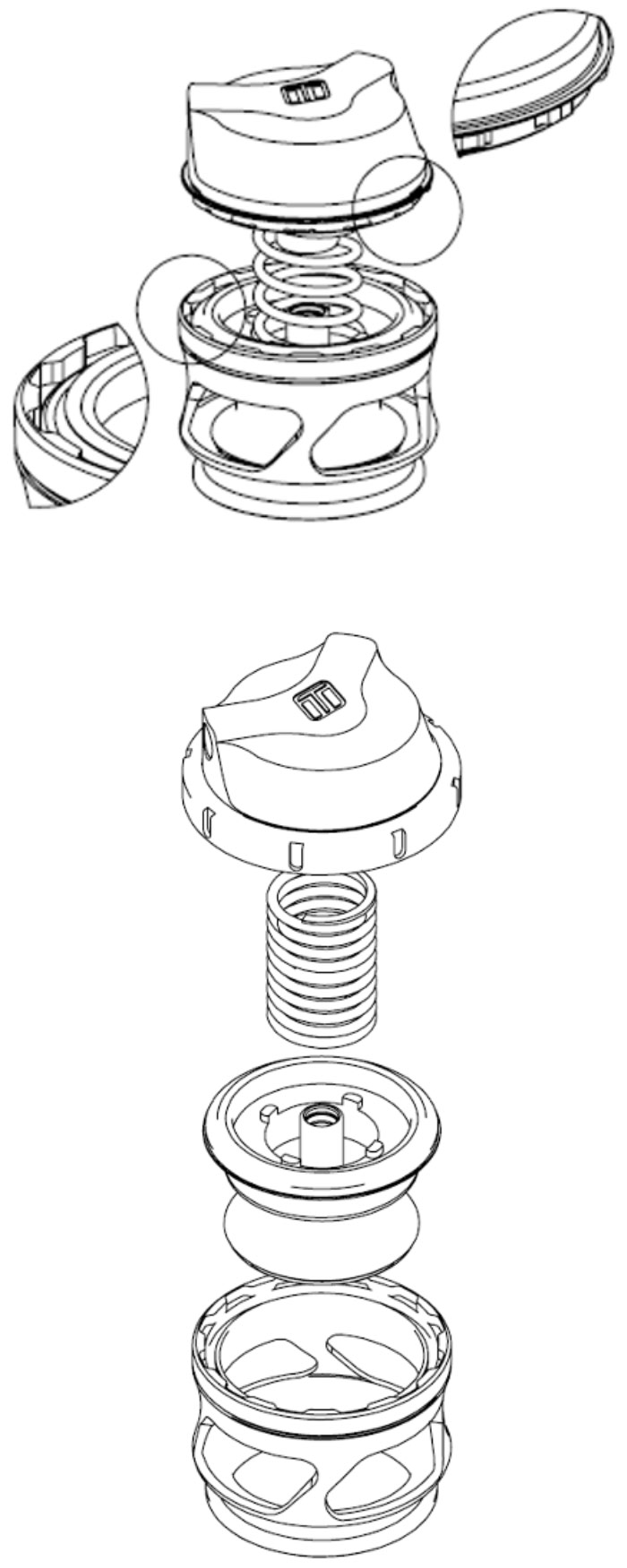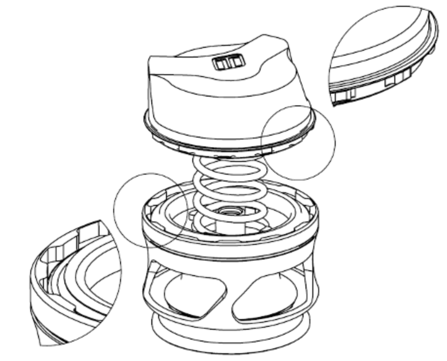 Locate cap and body notches and grooves which dictate the alignment of the cap. These notches are used to locate the cap onto the body and must be aligned prior to compression of the cap onto the body.