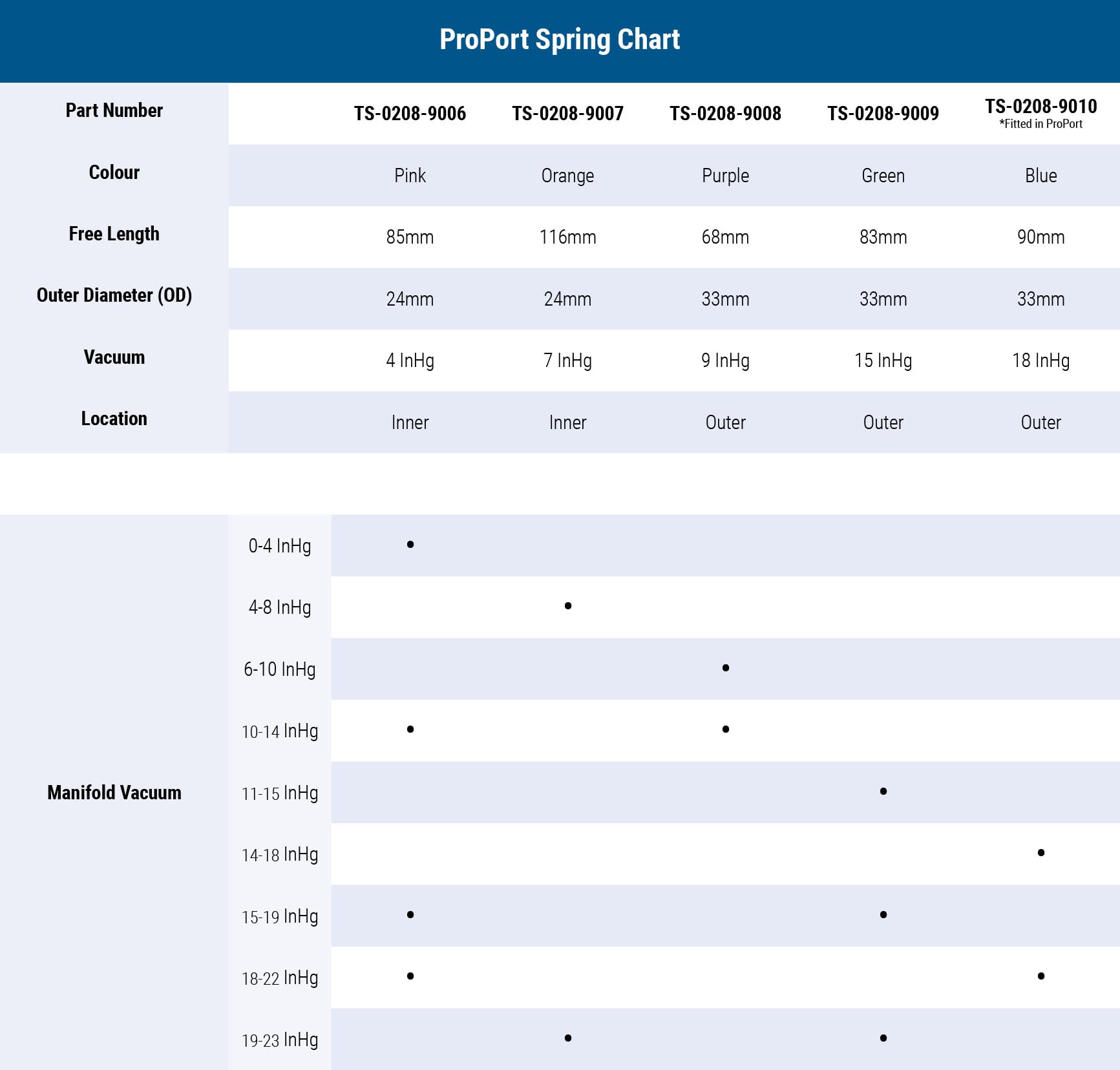 The GenV ProPort has a variety of springs to suit different Vacuum levels and applications. Turbosmart provides the GenV ProPort pre-installed with 18InHg spring. Different spring combinations may be required to suit different application requirements and tuning.