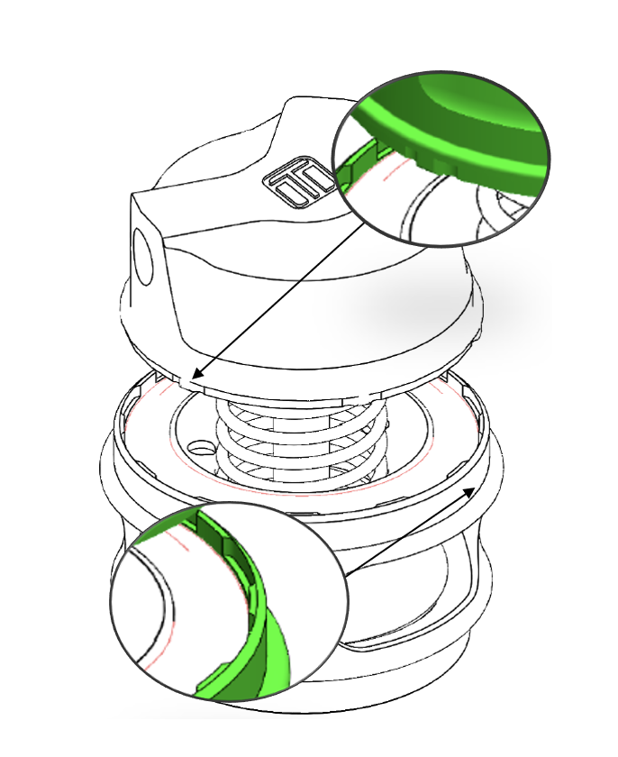 Locate cap and body notches and grooves which dictate the alignment of the cap. These notches are used to locate the cap onto the body and must be aligned prior to compression of the cap onto the body.