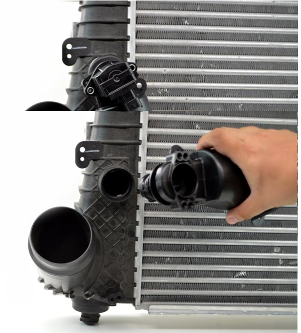 Once the intercooler assembly is removed from the vehicle, the OEM BOV can be upgraded. Remove the OEM BOV by undoing the two bolts holding it onto the BOV chamber.