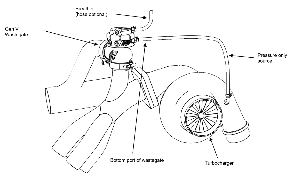 If no boost controller is being used, connect the boost pressure source to your Turbosmart wastegate actuator. Boost reference hose plumbing logic will depend on the product being used as well as the style of boost control. Consult your wastegate instructions, the most basic example has been provided below.