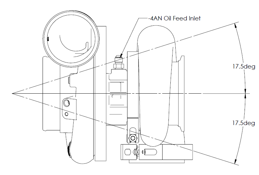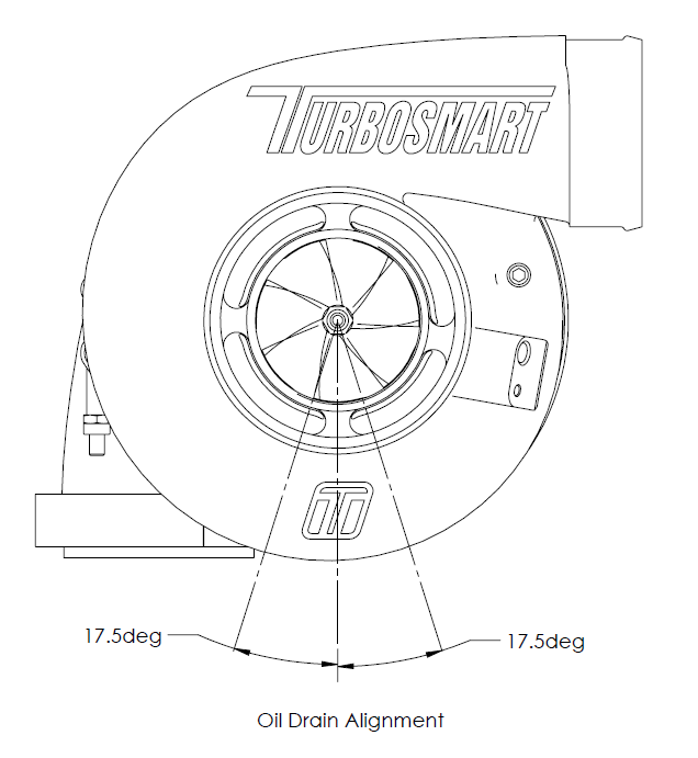 Turbocharger lubricating oil must also drain into the sump. A unrestricted path for the oil drain should be fed back into the sump of the engine. Correct oil drain flanges are available below. The oil drain has an acceptable limit of 35 deg to allow for correct drainage to the sump.